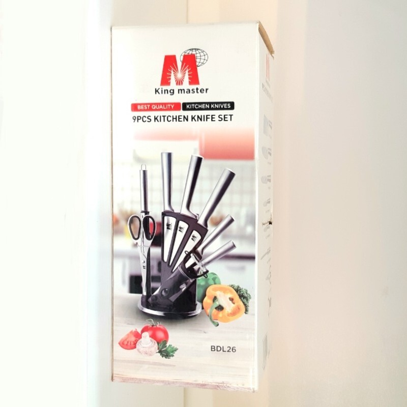 سرویس کارد King Master مدل BDL-26 دارای ۴ عدد چاقو در سایزهای مختلف و یک عدد ساطور دارای سوهان چاقو تیزکن و یک عدد قیچی آشپزخانه به همراه یک عدد پوست کن دارای پایهء مقاوم با ایستایی بالا