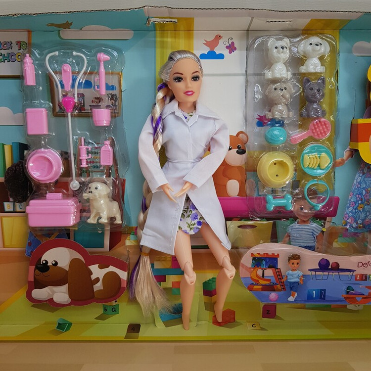 - دامپزشک حرفهای: باربی در نقش یک دامپزشک مهربان با لباسهای حرفهای، آماده مراقبت از حیوانات است.